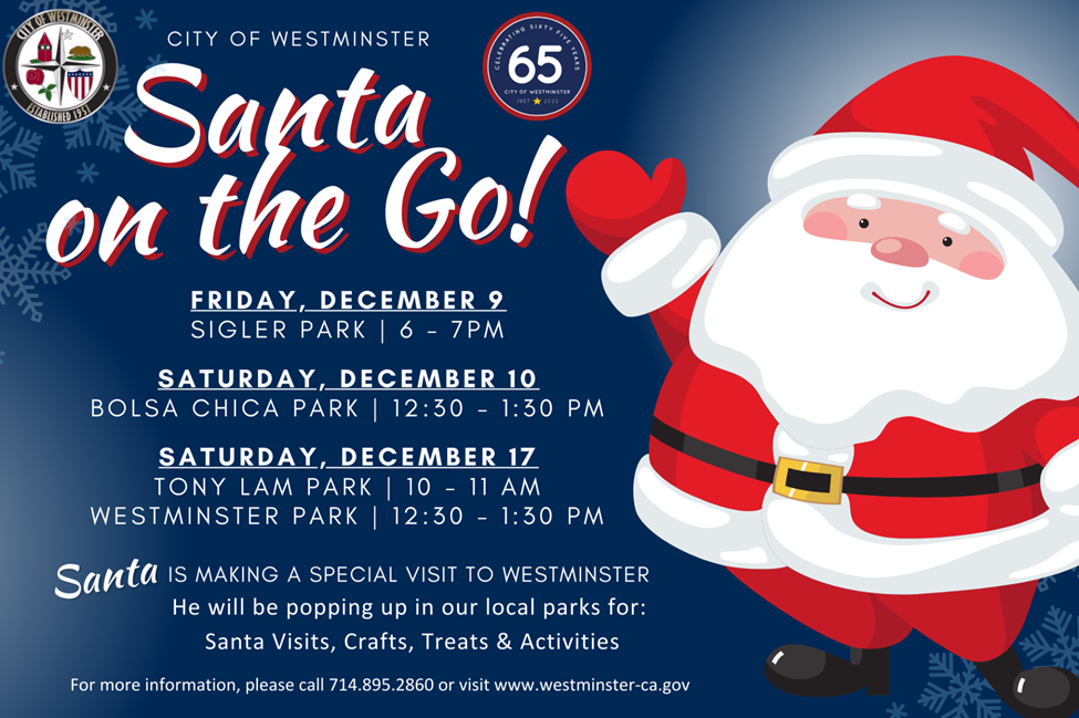 Home / Manager's Messages / Holiday Events Holiday Events Posted By dstgeorge on December 13, 2022 The City of Westminster is hosting “Santa on the Go!” at local parks. Please see the information on the attached flyer below for the schedule or visit www.westminster-ca.gov.